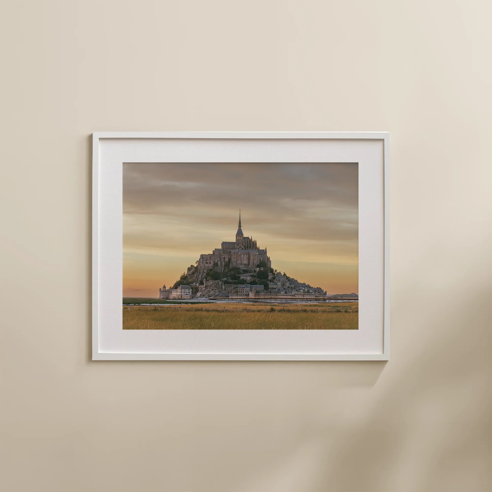 Enjoy the beauty of Mont Saint Michel Sunset print. The warm colors of the setting sun light up the summer grass, while the ancient abbey stands tall in the background. In the distance, glistening remnants of tidal waves snake through the grass, underneath the access bridge.